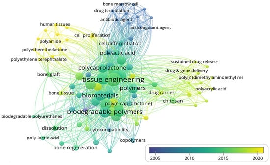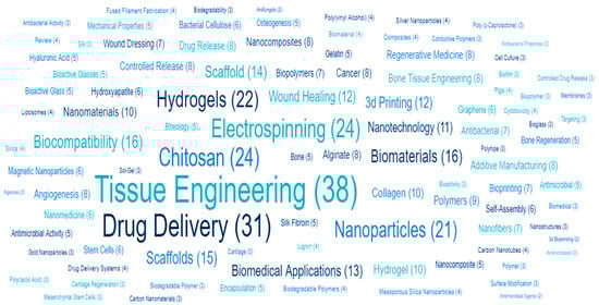 Three-dimensional bone bioactive nanocomposite scaffolds can be fabricated from a wide variety of bulk biomaterials, such as bioceramic tricalciumphosphate (TCP), hydroxyapatite (HA), and bioglass (BG); or biodegradable polymer—collagen, chitosan, alginate, fibrin, polyesters, and polyethylene glycol (PEG) [13,14,15,16,17,18]. It was demonstrated that their composites represent a suitable alternative because they combine the advantages of both bioactive ceramics and biodegradable polymers for bone tissue engineering. The reason for this is simple: ceramics present weak mechanical properties due to brittleness (hard material with small elongation to failure) and the polymers present a deficiency in their compressive modulus compared with native bone tissue (polymers are typically too soft) [8]. Thus, these systems can reduce the disadvantages and offer new advantages in the case of bone tissue reconstruction. The Word-Cloud info-graphic plugin’s aim should be to provide succinct visually graphics representations of these kind of contextual features for better accessibility throughout intrusion-network mapping analysis of the existing-review as exhibits in the Figure 1. A word-cloud visualization of the keywords examined in this article is shown in Figure 1.