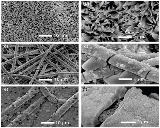 Microstructure of mineralized PLLA matrices: (a) electro-deposition at 3 V, 60 °C for 1 h; (b) high-magnification picture of (a,c) mineralized in 1.5 SBF for 12 days; (d) magnified image of (c,e) mineralized in 1.5 SBF for one month; and (f) magnified picture of (e). Reproduced with permission from [33].