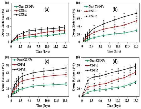Diclofenac-embedded pure CS-NPs, CNPs1, and CNPs2 in vitro release of drugs studied at 37 °C in varying acid levels and environmental conditions: (a) pH 2, (b) pH 6, (c) pH 7.4, and (d) pH 9. The results are presented as an average deviation of ±3. Reproduced with permission from [34].