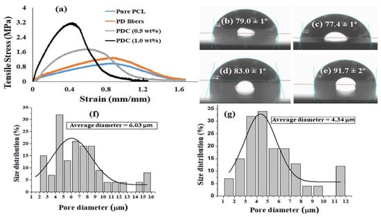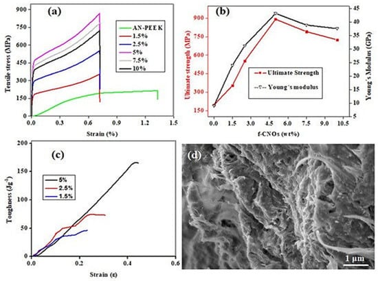 In another study, Mamidi et al. [35] developed PAPMA-CNOs and AN-PEEK biopolymer matrix composites. The authors observed that interactions between CNO and DOX played a vital role in controlling the drug release from the thin film. This film possessed a tensile strength of 891 MPa, an elastic modulus of 43.2 GPa, and a toughness value of 164.5 J/g. This thin film is used in numerous medical applications. To examine the fracture deformation phenomenon during the tensile test, the researchers analyzed the delamination zone under tensile loading. The sheets had a relatively uniform homogeneous and compact morphology, as illustrated in Figure 5.