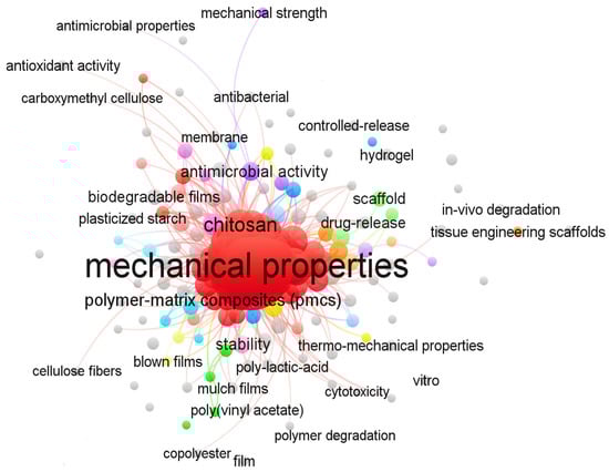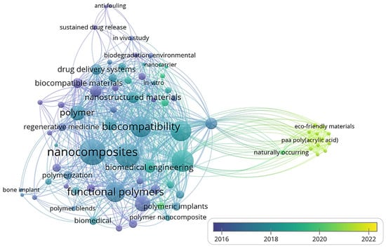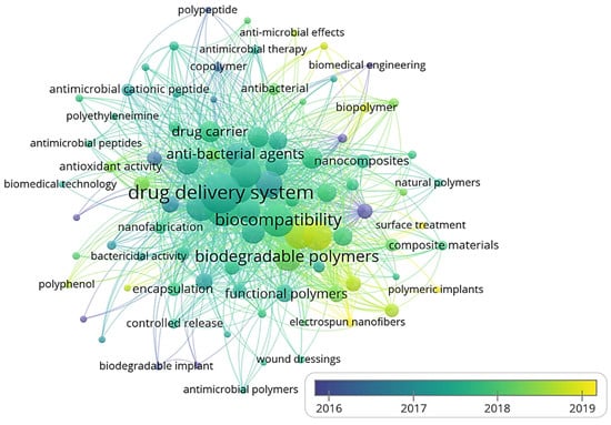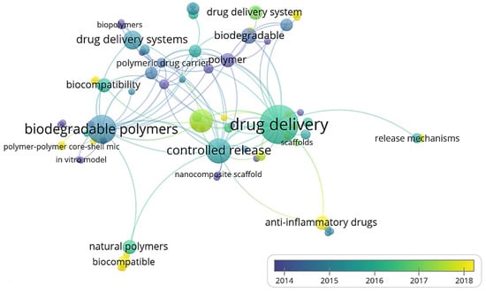 Infographic word-cloud visualization of the semantic clustering network of the keywords for physicomechanical, thermostability, and in vitro drug release studies of bioactive/biodegradable polymeric materials with remarkable biocompatibility in biomedical research.