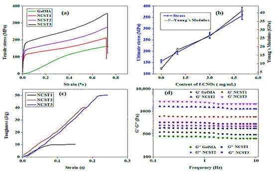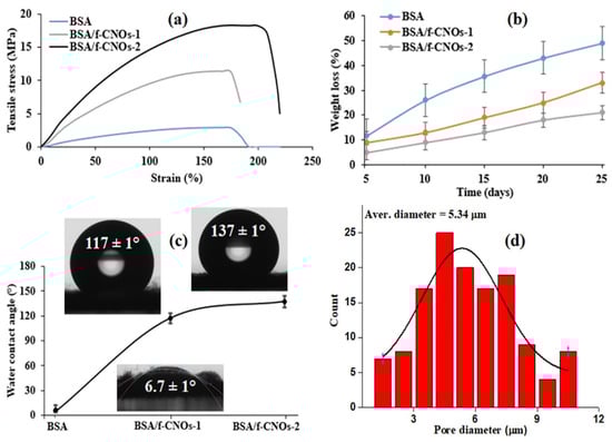 Physicomechanical analysis of biopolymer composite films employing quantitative techniques: (a) load displacement; (b) ultimate strength elastic moduli; and (c) impact–strength–strain graphs from uni-axial tensile nanocomposite thin films. (d) SEM micrographs of the fractography of biopolymeric nanocomposites comprising 5% of f-CNOs, produced by tear testing on perforated grooved specimens. Reproduced with permission from [35].