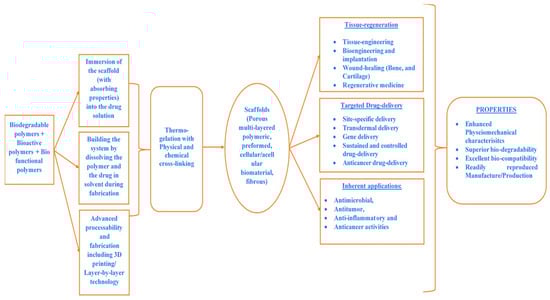 To date, numerous porous nanocomposite scaffold materials have been investigated. However, these materials still present challenges due to their capability for regeneration and remodeling, and for mimicking the complicated physiochemical attributes of bone. In addition, the functionality of the scaffolds has been studied by loading biomolecules (drugs, growth factors (GFs)) onto the scaffolds to treat bone disorders or to act on the surrounding tissues [10,11,12].