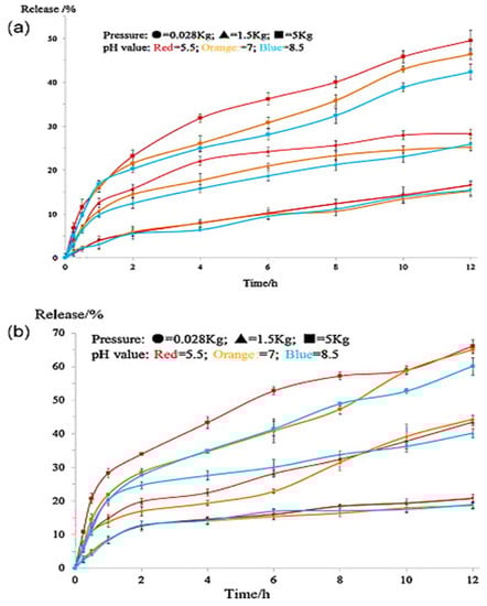 Therefore, CNPs provide a better pH and temperature-triggered drug delivery platform for the GI tract and colon-targeted drug delivery, in addition to the highest drug release under specific pH and temperature values, as displayed in Figure 4.