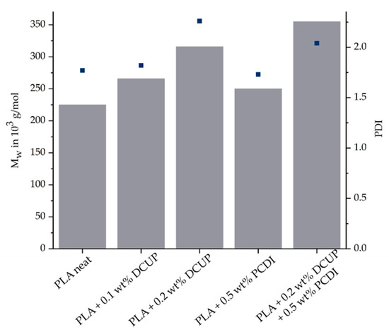 The used PLA was modified on a twin-screw extruder with DCUP (0.1 wt%/0.2 wt%) and PDCI (0.5 wt%). After the reactive modification, the effectiveness of the modifiers was verified. One way to investigate this is by the method of SEC, which can be used to determine the molar mass and a molar mass distribution. The principle is based on the separation of molecules according to their molecular size. Figure 2 shows the molar mass and polydispersity index (PDI) of all produced compounds.