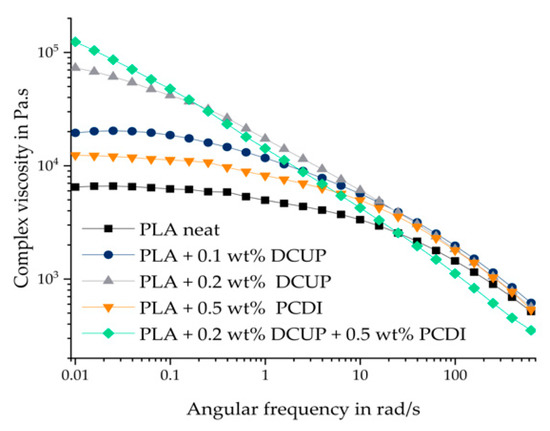 The organic peroxide led, as well as the PDCI, to an increased molar mass. As the amount of DCUP increases, this effect is enhanced. The addition of PCDI leads also to an increase in molar mass but is less pronounced than DCUP. The reason why the molar mass does not increase that much is that PCDI only reacts with the end groups of PLA. The combination of DCUP and PCDI showed the highest increase in molar mass. The results show on the one hand that a successful modification took place during the reactive extrusion on the twin-screw extruder and thus a chemical reaction between the two components has occurred. Furthermore, the increase in molar mass indicates a change in the linear structure of the PLA, which will be considered in more detail in the following rheological investigations.
