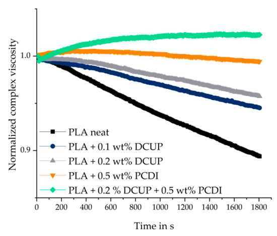 The time sweep was done for 30 min at isothermal temperature of 180 °C for all investigated compounds. It can be seen that the neat PLA has the highest degree of degradation, followed by the different peroxide-containing compounds. The PCDI stabilized material and the modified stabilized modifications show the highest relative viscosity indicating no or even a low degradation during the timesweep. After the first 400 s, for all materials except those with PCDI, the normalized complex viscosity decreases due to degradation processes. The use of PCDI led to the desired stabilization process. However, only a slight decrease in complex viscosity for the PLA with 0.5 wt% PCDI can be observed after 30 min. Additionally, the reaction regarding the chain extension proceeded completely and no post-reactions could be observed. The combination of DCUP and PCDI has the highest complex viscosity and is stable over the time of 1800 s.