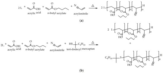 The general aim of this work is to develop PSAs for glass bottle labels that meet the requirements currently demanded by the market. As mentioned, this is very complicated. In previous articles [14,15], an attempt has been made to arrive at this balance by modifying the composition of the polymer. However, the desired values have not been reached. For this reason, this study has attempted to reach this objective by modifying only the process for obtaining the polymer, keeping the monomeric composition constant. To find this optimal balance in the adhesive properties, between tack, peel resistance, and shear resistance, the monomeric composition was a 1:1 combination of two different water-based acrylic polymers, A and B. Polymer A was designed with a high content of acrylic acid (AA) in order to obtain high molecular weights that would favor the attainment of high values of shear resistance. Instead, polymer B was designed with a low AA content and a chain transfer agent (tert-dodecyl mercaptan) was added to the formulation in order to obtain low molecular weights that gave good peel resistance and tack results. Both A and B were copolymerized with butyl acrylate and acrylonitrile, as shown in Figure 1. This type of polymerization takes place in a random way [15].