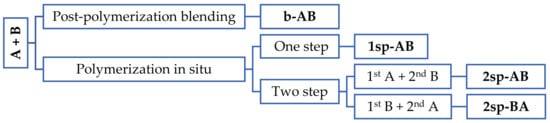 Four methods were carried out to obtain the polymers: by physical blend of polymers after their polymerization; by polymerization in situ in one; and by polymerization in situ in two steps, where in each step, one of these formulations (A or B) was synthetized and two different polymerization orders were tested, as shown in Figure 2.