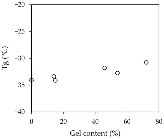 Samples with a higher gel content displayed higher Tg values. This relationship is generally attributed to the effect of the polymer chain mobility. Those samples with more entanglements and crosslinked display less mobility, which was reflected in their Tg values [25,26].