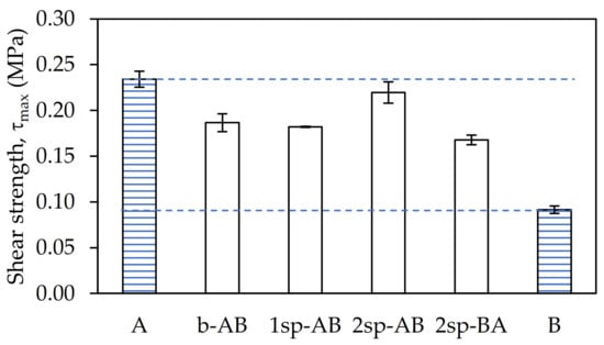 Otherwise, samples b-AB and 2sp-BA were more similar to sample B. In both cases, 0.1 phm of TDM was enough to obtain the same values of B, where 0.2 phm of TDM was used. However, sample 1sp-AB showed an increase of 70% with respect to sample B. Regarding the results obtained in the shear resistance test, in general, all samples showed very low values, except for sample A, owing its high AA content. However, sample 1sp-AB was the second sample with the highest value.