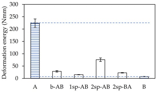 Finally, the toughness of the adhesives was determined as the deformation energy up to the adhesive failure in the dynamic shear test and was calculated from the area under the force–displacement curve up to the maximum force value. As shown in Figure 6, sample A required more energy than the rest.