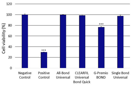 Cytotoxicity of the investigated adhesives. Test performed using the Cell Proliferation Kit II (XTT) assay after 24 h incubation of cells with the tested compounds. The positive control constituted cells were suspended in 96% isopropyl alcohol, while the negative control cells were cultured in a complete medium. The differences were statistically significant on the graphs as follows: *** p < 0.001 versus negative control.