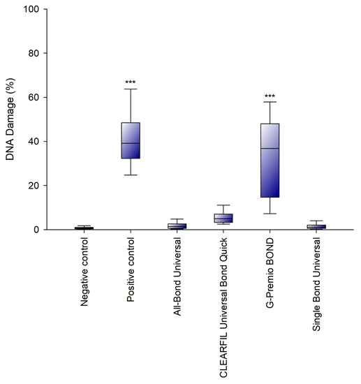 A significant increase in DNA damage was observed after the 24 h incubation in the cells treated with G-PREMIO Bond. The other systems used did not induce significant DNA damage in the investigated SC cell line (Figure 2).