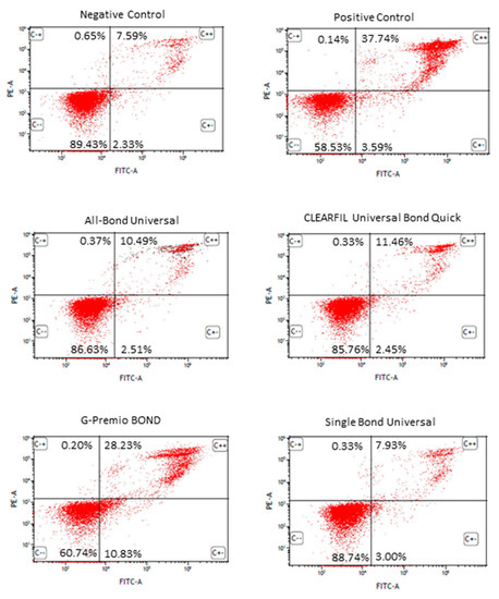 3.3. Apoptosis Detection by FITC Annexin V/PI Double Staining of the Universal Dental Adhesives
