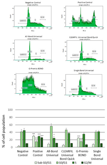 The cell cycle progression of the SC cells treated with the investigated compounds was similar to the SC cells cultured in the complete medium, except that the obtained results demonstrated an arrest in the G2/M phase of the SC cell cycle treated with nocodazole used as a positive control. The G-Premio Bond triggered a significant increase in the percentage of SC cells in the sub-G0/G1 phase and a significant decrease in the percentage of cells in the G1 phase of the cell cycle as compared to the negative control. Moreover, we noticed a decrease in the percentage of SC cells treated with All-Bond Universal in the S phase of the cell cycle (Figure 4).