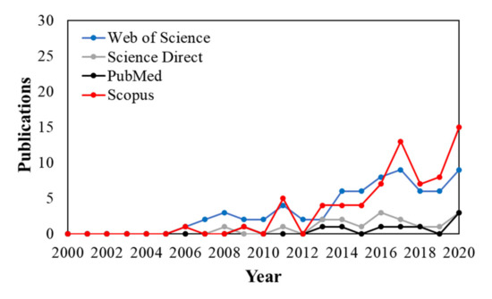 The publications per year according to the research database’s string search: ((“natural antimicrobials” OR “essential oils” OR “bioactive compounds”) AND (packaging OR coating OR nanopackaging) AND cheese).