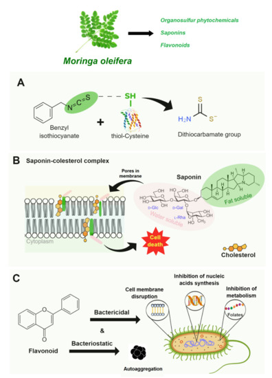 Antimicrobial mechanisms of Moringa oleifera bioactive compounds: (A) Protein damage-triggered by benzyl isothiocyanates bioconjugation with cysteine. (B) Membrane dysfunction-triggered by saponins complex formation with cholesterol. (C) Bacteriostatic and bactericidal effects of flavonoids.