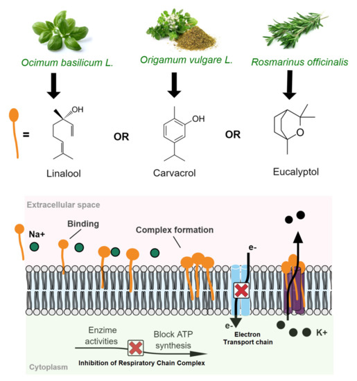 The oxygenated terpenes sucg as linalool, carvacrol, and eucalyptol are bioactive compounds present in primary contents at basil EO (O. basilicum), oregano (O. vulgare), and rosemary (R. officinalis) EOs, respectively, with antimicrobial activity. The antimicrobial mechanism of linalool was proved to be associated with damaging cell membrane integrity-triggered by membrane permeability (by interactions with phospholipids), resulting in nucleic acid releasing and membrane depolarization, thus resulting in cell death by measures of releasing nucleic acids and membrane potential [38]. Furthermore, these monoterpenoids’ effects on the cell membrane can also inhibit the mitochondrial respiratory chain complex-triggered by proton pump dysfunction and intracellular ATP depletion [45,50,51]. Figure 3 shows the antimicrobial mechanisms of action associated with the destruction of membrane cell integrity triggered by monoterpenoid compounds from O. basilicum, O. vulgare, and R. officinalis essential oils.