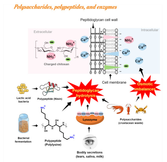 Figure 4 summarizes the most common antimicrobial mechanism linked with natural antimicrobials such as polysaccharides (CS, chitin), polypeptides (nisin, poly-lysine), and lysozyme.