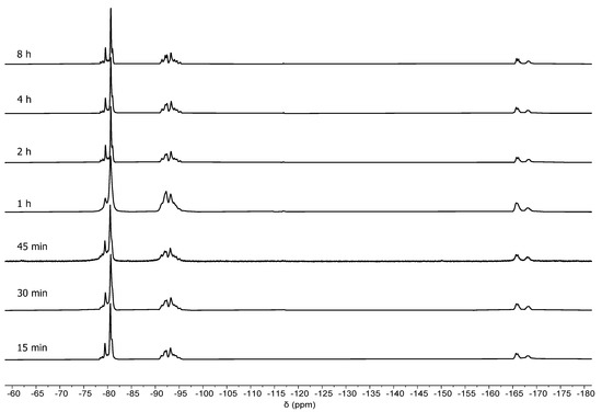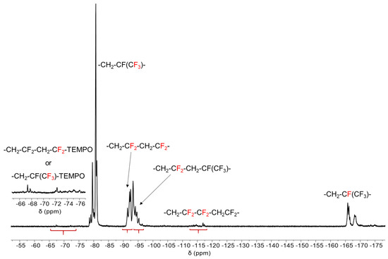 The 19F NMR spectrum of P(VDF-co-1234yf) copolymers terminated at 8 h (Figure 3, Table 1, Entry 8) clearly displays a number of characteristic signals attributed to both comonomers: (i) the characteristic peaks ranging from −90.6 to −95.4 ppm correspond to the normal or Head-to-Tail (H-T) VDF-VDF dyads (-CH2-CF2-CH2-CF2-) in the PVDF chains, while those at −114.6 and −116.9 ppm are attributed to the reverse or Head-to-Head (H-H) VDF-VDF dyads (-CH2-CF2-CF2-CH2-) [6,7,23,25]; (ii) signals from −95.4 to −92.7 ppm are assigned to CH2-CF2-CH2-CF(CF3)-; (iii) the trifluoromethyl and tertiary fluorine groups of 1234yf in the -CH2-CF2-CH2-CF(CF3)- dyads of the copolymer are assigned from −78 to −82 ppm and in the −164 to −169 ppm range, respectively; (iv) and finally, closer inspection in regime between from −66 to −76 ppm revealed the presence of a series of peaks which could be attributed to fluorine groups of VDF or 1234yf adjacent to TEMPO end groups [17,18].