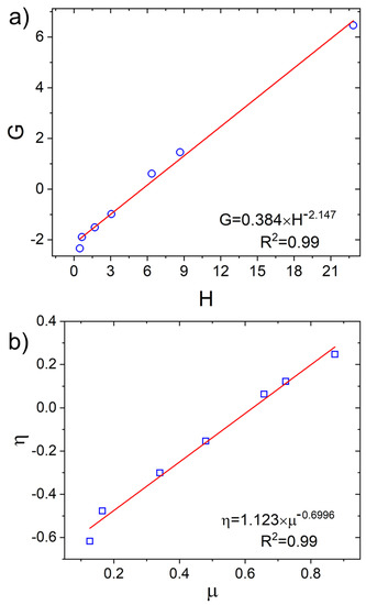 involving η and μ parameters which are mathematical functions related to the mole ratios in the monomer feed and in the copolymer and an arbitrary constant α. Such parameters are defined as η = G ( a + H ) and μ = H ( α + H ) and α = ( H m i n H m a x )0.5, where Hmin and Hmax are the highest and lowest values of H from the Fineman-Ross method. Thus, a plot of η versus μ gives a straight line which can be extrapolated at μ = 0 and μ = 1, thereby yielding r 2 a and r 1 as the respective η intercepts.
