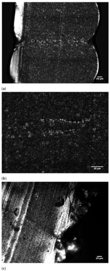 The sections with thickness of 10 m from sectioning with the microtome, which are placed between glass microscopy slides are visualized with Polarized Light Microscopy (PLM). An Olympus BX41 Phase Contrast & Darkfield Microscope (Olympus, Shinjuku, Tokyo, Japan) equipped with Olympus SLMPlan 20× and 50× objectives (Olympus, Shinjuku, Tokyo, Japan) and a Hamamatsu C4742-95 Orca 100 CCD Monochrome Camera (Hamamatsu, Hamamatsu City, Japan) is employed. Cross-polarizers are utilized to reveal Maltese crosses corresponding to spherulites of the crystalline morphology. Images are taken with the HiPic acquisition software (Hamamatsu, Hamamatsu City, Japan) around the weld regions of interest. Spherulite diameters are measured with ImageJ image analysis software. The diameter of ten spherulites around the interlayer interface is measured. An average and standard deviation are calculated for each set of ten measured spherulite diameters.