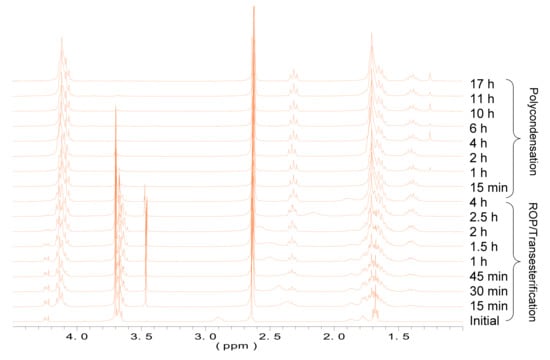 By means of some signals of the 1H NMR spectrum, it was possible to follow and control the reaction during the synthesis of all copolyesters. The first nine spectra represent the ROP/transesterification step, which in this case took approximately 4 h. Then, the following eight spectra show the reaction evolution during the polycondensation step, which was carried out under vacuum for 17 h.