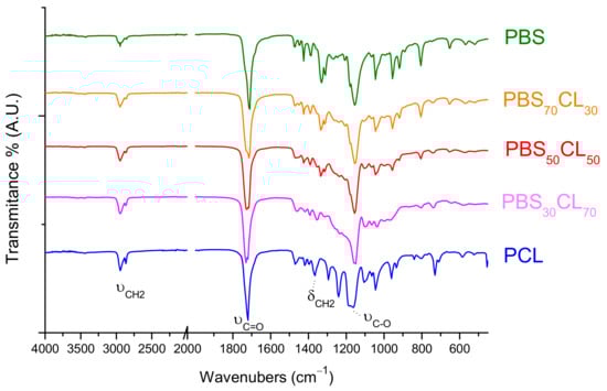 Figure 4 shows the infrared spectra of the copolymers where the representative absorptions of the functional groups of each comonomeric unit can be distinguished. The characteristic ester-stretching (C=O) absorption appears at 1721 cm−1 for PCL, and it is shifted to lower frequencies for PBS, which appears at 1712 cm−1. Absorption bands due to C-O stretching are observed at 1162 and 1152 cm−1 for PCL and PBS, respectively. For PBSxCLy copolyesters, both carbonyl stretching bands are observed, with the intensity of the 1721 cm−1 absorption increasing as the content of CL increases in the copolymer. Additionally, for PBSxCLy copolyesters, a broad band centered at 1729 cm−1 is observed, which is attributed to both carbonyl stretching absorptions in the amorphous phase.