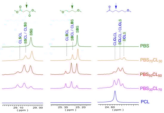 Some peaks appeared to be split into three or four peaks (Figure 6) due to sequence distribution effects. As an example, signals from butylene carbons split into tree peaks due to the four butylene-centered triads, CLBCL, SBCL/CLBS, and SBS, which were observed and were used for quantification. The relative contents in the four triads for every copolymer composition and the application of the statistical method developed by Tessier et al. [] led to the determination of the degree of randomness R for the PBSxCLy copolyesters.