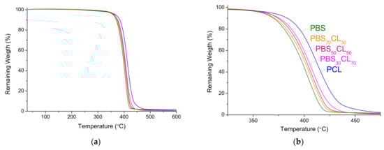 Thermogravimetric traces of PBS, PCL, and PBSxCLy copolyesters. (a) Full TGA traces; (b) expanded region where the thermal degradation with weight loss is observed.