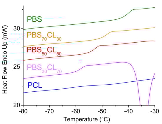 The fact that the melting point and the melting enthalpy of the PBS50CL50 split into two peaks can be explained by its “symmetrical” structure, as has been described before []. Both units present similar structures, with ester groups and the same number of methylenes. This could be the reason why their structures are compatible enough to crystallize together and present two different melting peaks, one from the CL crystallites and the other from the BS crystallites.