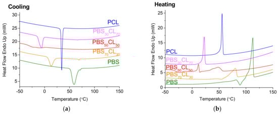 Figure 9 shows the DSC traces of the copolyesters upon cooling (a) and heating (b). Cooling DSC scans (Figure 9a) depict a crystallization peak during the cooling process in all the polymers, where a very broad exothermic peak is observed for the PBS50CL50 copolymer. This indicates that the crystallization occurs in the complete range of compositions. For homopolymers and copolymers enriched in one comonomer, it seems that the crystalline structure of the enriched monomer prevails. This behavior has been previously reported by powder X-ray diffraction studies (WAXS and SAXS), where the crystalline structure of PBS was observed for copolyesters enriched in butylene succinate units and the one of PCL for copolyesters is enriched in caprolactone units []. In the copolymers with equal content of both comonomers, the two crystalline structures seem to be present, as two exothermic peaks are observed. Both CL and BS repeating units present similar structures, which allow both units to crystallize in different crystal lattices and their content could be modulated by the rate of cooling, as it has been reported by Safari et al. [], indicating that this eutectic composition presents an isodimorphic crystallization.