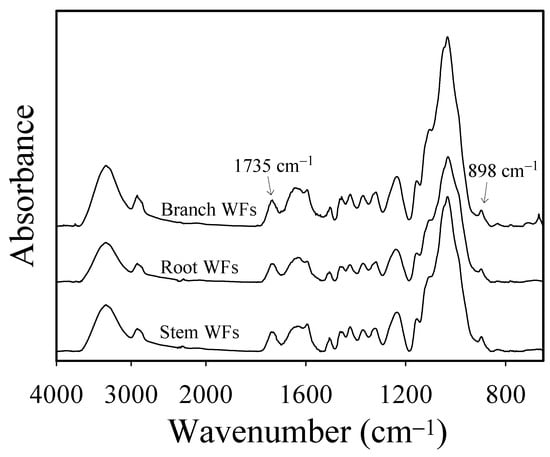 ATR-FTIR spectra of WFs from various pomelo tree parts.