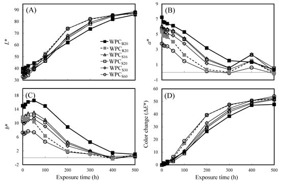 The color change of various WPCs during xenon arc accelerated weathering. (A) L*, (B) a*, (C) b*, and (D) ΔE* values. Each reported value is the average of five replicate specimens for each formulation.