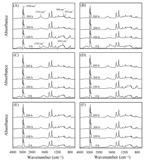 ATR-FTIR spectra of various WPCs before and after xenon arc accelerated weathering for 100, 300, and 500 h. (A) WPCB20, (B) WPCR20, (C) WPCS16, (D) WPCS20, (E) WPCS30, and (F) WPCS60.