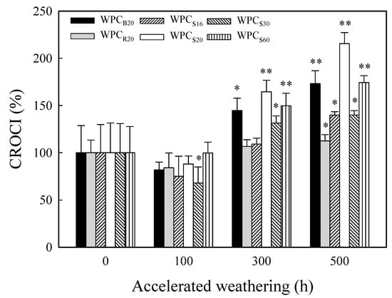 The CROCI values of various WPCs before and after xenon arc accelerated weathering for 100, 300, and 500 h. Values are mean ± SD (n = 5). *: p < 0.05; **: p < 0.01 (one-tailed test) compared to the unweathered WPC.
