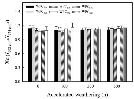 The Xc values of various WPCs before and after xenon arc accelerated weathering for 100, 300, and 500 h. Values are the mean ± SD (n = 5). **: p < 0.01 (one-tailed test) compared to the unweathered WPC.