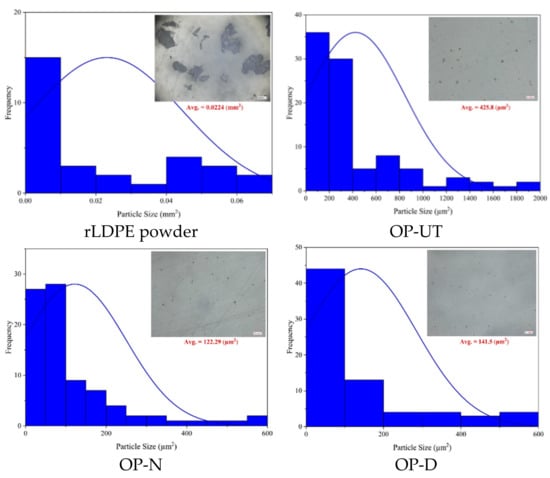 The rLDPE powder was acquired from Suzhou Poks Machinery Co., Ltd. (Suzhou, China). The OP residues were provided by a local industry in Palestine. First, the OP residues were powdered by using a flour mill grinding machine, followed by powder sieving with a mesh size of 100. The raw powder was used as a filler for the rLDPE matrix without any modification, and it was denoted by OP-UT. In addition, two more sets of samples were obtained: (1) by treating the powder using NaOH as described in [], which was denoted by OP-N; (2) by treating with distilled water/ dimethyl sulfoxide (DMSO) (50/50 wt.%) for 2 h at 100 °C, which was denoted by OP-D. The properties of the rLDPE used in this study were first measured and reported for comparison purposes, as shown in Table 1. The optical microscopy (VHX-5000 series, Osaka, Japan) images of the rLDPE and used fillers were processed with the ImageJ software program to obtain the particle size distribution, as shown in Figure 1.
