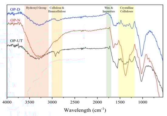 TGA/DTG was used to investigate the thermal behavior of OP-UT, OP-N, and OP-D under an inert atmosphere, as shown in Figure 8. Cellulose is the main component of OP. The decomposition of cellulose in an inert atmosphere is normally an endothermic process because cellulose is resistant to thermal degradation due to its crystalline nature. As seen in the TGA of the samples, the first decomposition zone (under 140 °C) displays a mass loss that is associated with the removal of moisture. The TGA curves, depicted in Figure 9, reveal an evident change in the thermal degradation process of the treated OP due to the removal of the wax and impurities along with the partial removal of the amorphous content. By increasing the temperature, as shown in the DTG, OP-UT and OP-N fillers undergo two subsequent degradation steps; the first zone is in the range of 200–330 °C and 200–380 °C for OP-UT and OP-N, respectively. This includes a major mass loss, which indicates an overlapping simultaneous degradation of holocellulose (cellulose and hemicellulose), whereas the second zone in the range between 430–490 °C is attributed to lignin degradation. It is noteworthy that lignin degradation proceeds gradually over a wider temperature range than cellulose and hemicellulose. However, for the OP-D, three degradation zones were observed in the ranges of 150–240 °C, 250–310 °C, and 310–390 °C. These are attributed to the degradation of hemicellulose; simultaneous degradation of hemicellulose, cellulose, and lignin; and simultaneous degradation of cellulose and lignin, respectively. Overall, the enhanced thermal characteristics of the treated filler confirm its potential use as a stable filler for the advanced synthesis of bio-composites even at high temperatures.