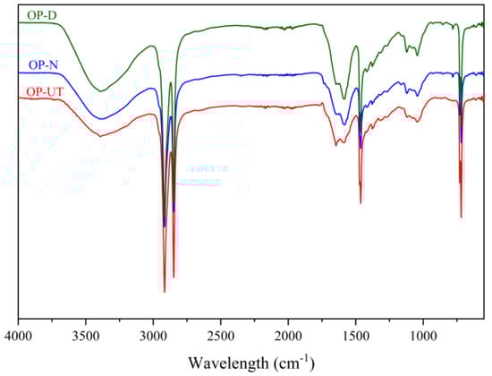 FTIR spectra of the raw filler (OP-UT) and treated filler (OP-N and OP-D).