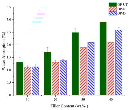 Figure 5 presents the water absorption of the developed biocomposites when using the untreated and treated fillers. The water absorption characteristics are responsible for the filler characteristics. Generally, the use of the treated filler increases the water repellent properties of the biocomposites, which may be an indicator of good filler/polymer interfacial adhesion. A reduction in the water absorption that was observed in the treated filler indicates an improvement in the interfacial bonding between the treated filler and polymer matrix. This improvement was determined to be better in the case of the NaOH filler. This indicates that the NaOH treatment can better enhance the filler/polymer interfacial surfaces compared to the water/DMSO treatment. On the other hand, it was determined that the water absorption increases as the filler content increases. This is expected because the filler can absorb water due to its surface properties. Thus, it can be concluded that the treatment method is an appropriate method to decrease the absorption of water and improve the durability and stability of the developed biocomposites.