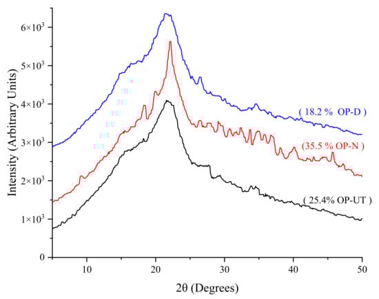 The X-ray diffraction (XRD) patterns, presented in Figure 6, reflect the influence of the chemical treatment on the crystallinity degree of the fillers. The crystalline plane (002) corresponds to the intense broad peak at 2θ = 22°, which is attributed to cellulose and hemicellulose dehydrates. In general, the broad peak, as shown for all the samples, represents poor crystallinity and the amorphous nature of the biomass content. It was determined that the crystallinity degree of the NaOH-treated OP increased to 35.5%, while that of the untreated OP is 25.4%. Meanwhile, the water/DMSO treatment reduces the crystallinity of the OP to 18.2%. Therefore, it is expected that the water/DMSO treatment may have altered the structure of the OP, removing a substantial amount of biomass and decreasing the degree of crystallinity, as confirmed by XRD. The enhancement in crystallinity was observed in the NaOH-treated filler. This suggests that incorporating NaOH can partially remove the amorphous biomass without affecting the crystalline biomass, particularly for cellulose. Therefore, it is expected that the properties of biocomposites depend on the filler surface properties, filler/polymer adhesion, and filler integrity after the treatment.