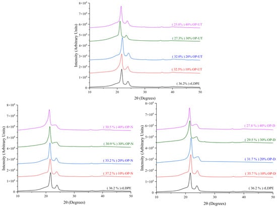 XRD patterns of the developed biocomposites in comparison to neat rLDPE.