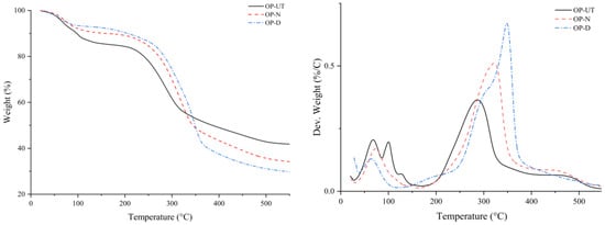 TGA/DTG curves of raw filler (OP-UT) and treated fillers (OP-N and OP-D).