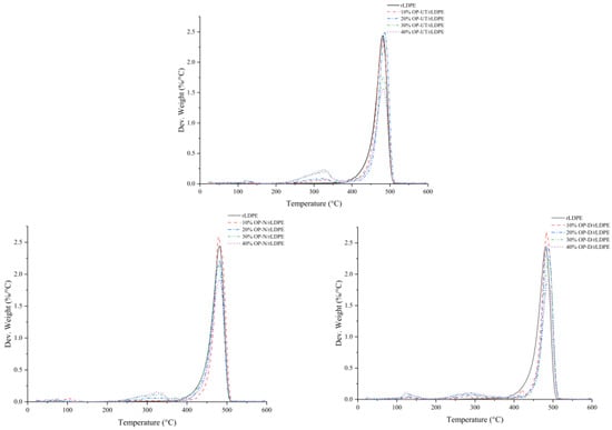 DTG curves of the developed biocomposites in comparison to rLDPE.