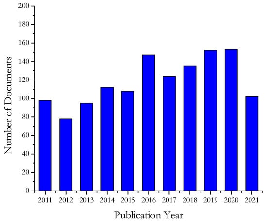 The adoption of accelerated aging procedures to make reliable previsions of long-term durability of polymeric materials has been the subject of several papers by international research groups starting from the 80s of last century, even though few pioneering studies have been published since 1952. From Scopus database (to date 30 June), we counted 1304 documents, published in journals, books, conference proceedings in the last ten years (2011–2021) searching for “polymer accelerated aging” in document title, abstract, keywords, whose yearly distribution is illustrated in Figure 1.