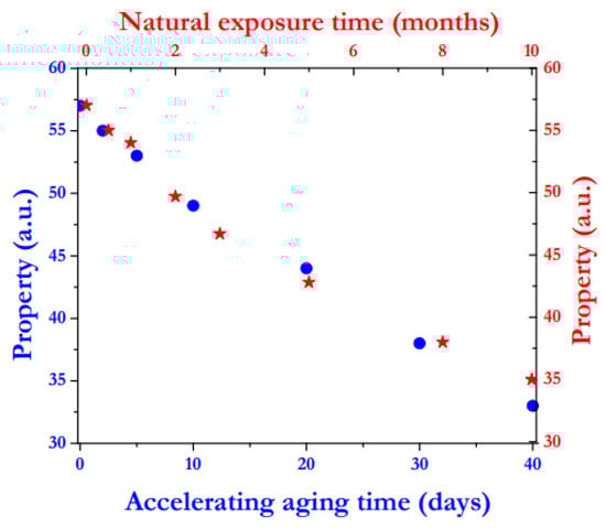 The rationale for the adoption of accelerated aging procedures clearly resides in the possibility to make reliable previsions of the on-field long-term durability of a polymer employing fast laboratory tests. This would imply the existence of good correlations between natural exposure tests and accelerated aging procedures. It could be stated, therefore, that the accelerated aging tests would be truly useful to make realistic durability previsions only if a precise correlation between the real behavior of the material exposed to the true external environment, whatever it is, for prolonged times and the experimental data from the accelerated aging tests would exist; in other words, if an “Equivalent time” can be calculated for the polymer under analysis, as in a hypothetic study illustrated in Figure 3. In other studies, an accelerated factor (k) is defined, as: