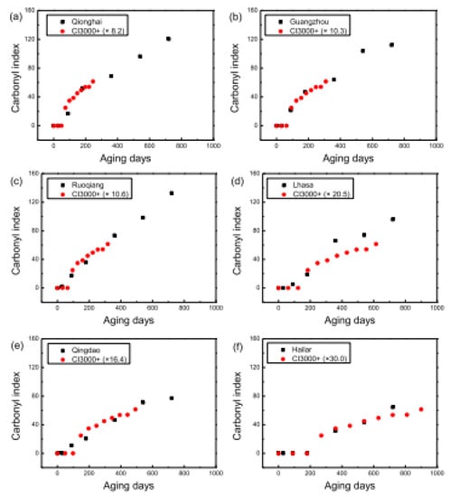 Comparison between results from outdoor exposure, performed in six different locations in China ((a): Qionghai; (b): Guangzhou; (c): Ruoqiang; (d): Lhasa; (e): Qingdao; (f): Hailar), and predictions from accelerated aging, based on carbonyl index. Reprinted with permission [31].