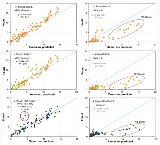 Found vs. predicted color shifts for white and clear materials (left) and black materials (right). The blue dotted lines show slope = 1 while the colored dashed lines show the linear regression with the equation in the legends. The three circled points on the lower left plot occurred near an abrupt color shift. The circled points on the right side graphs show the PPE blends. Reprinted with permission [18].